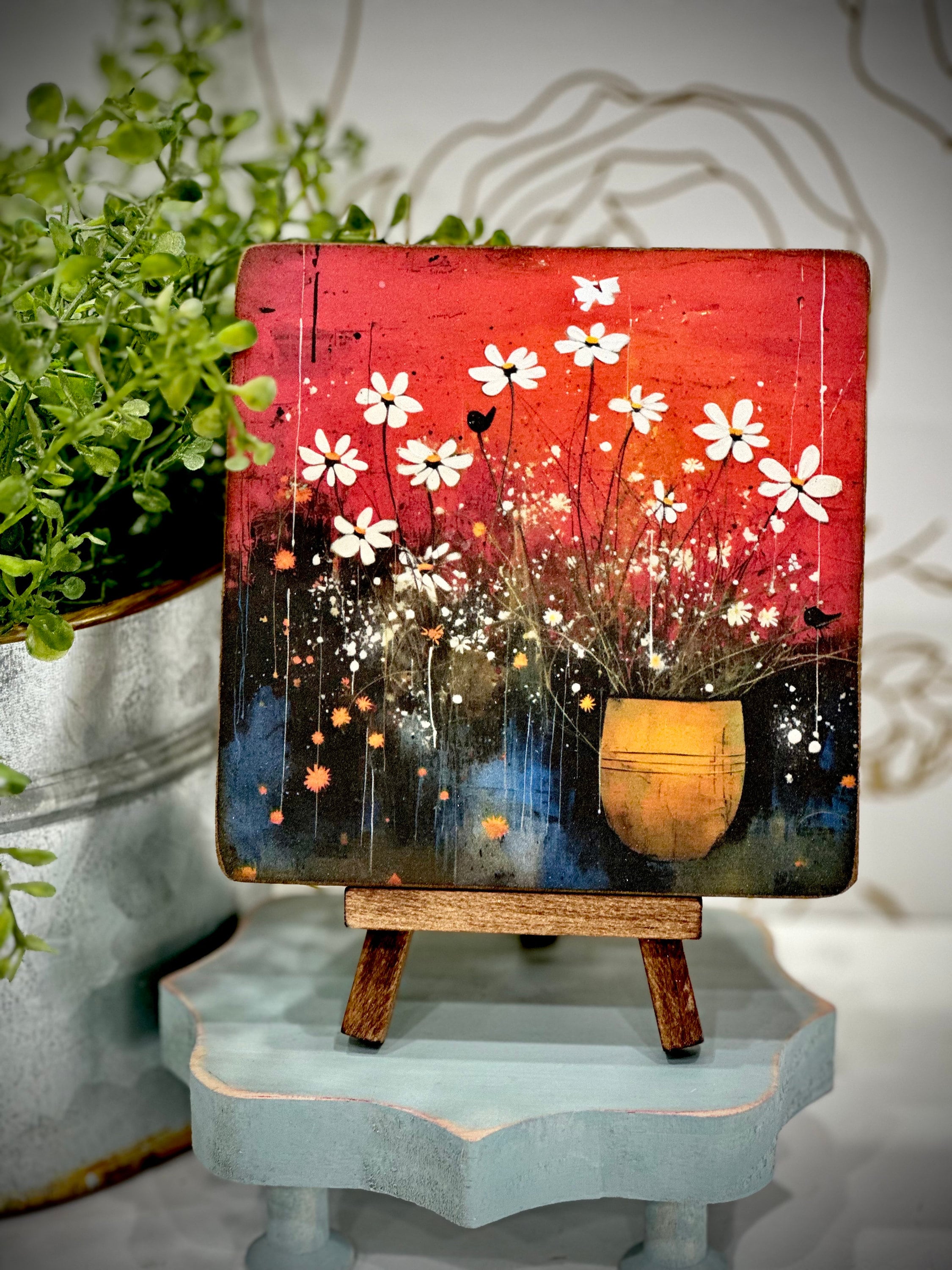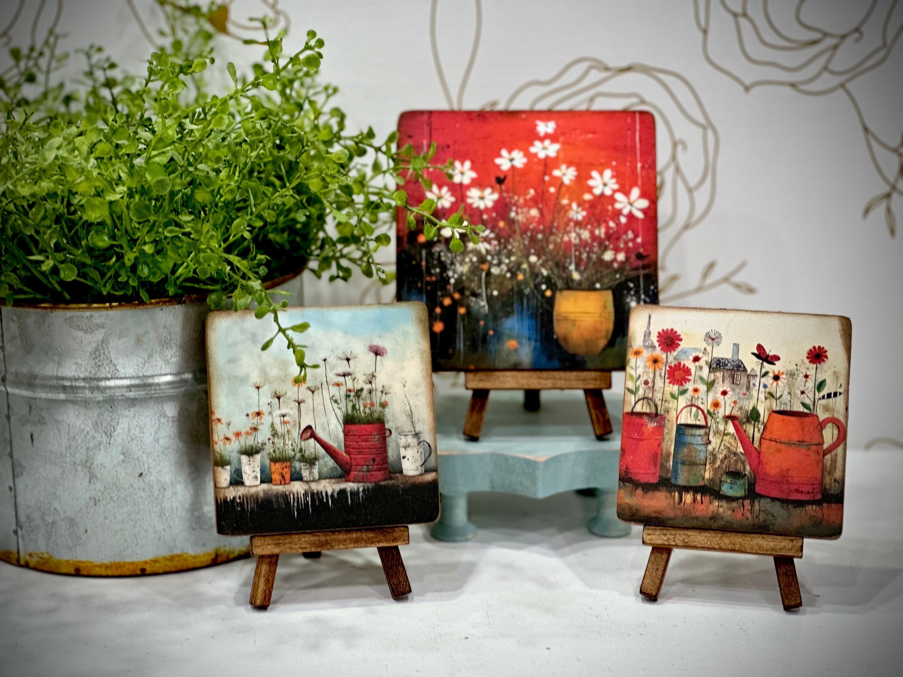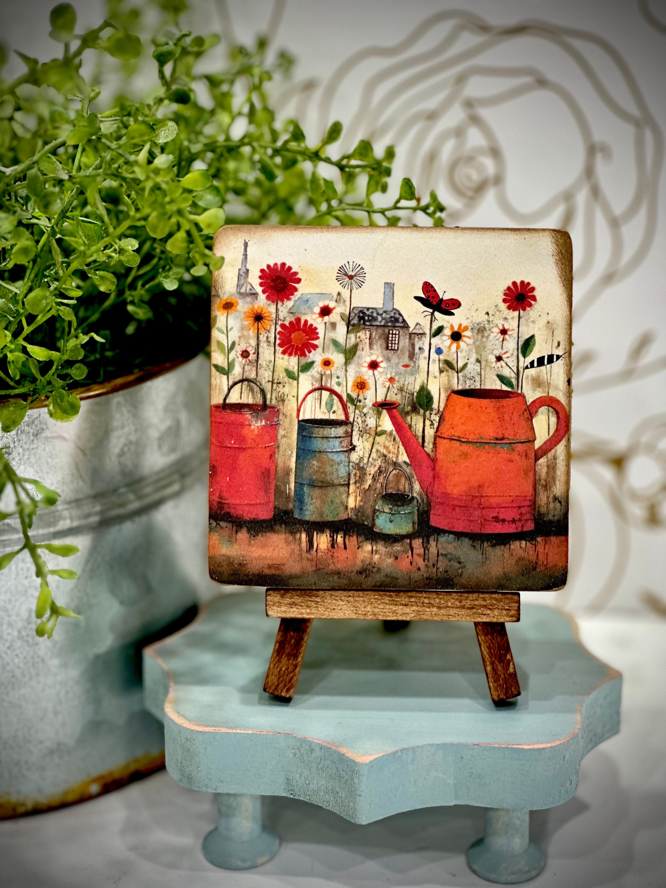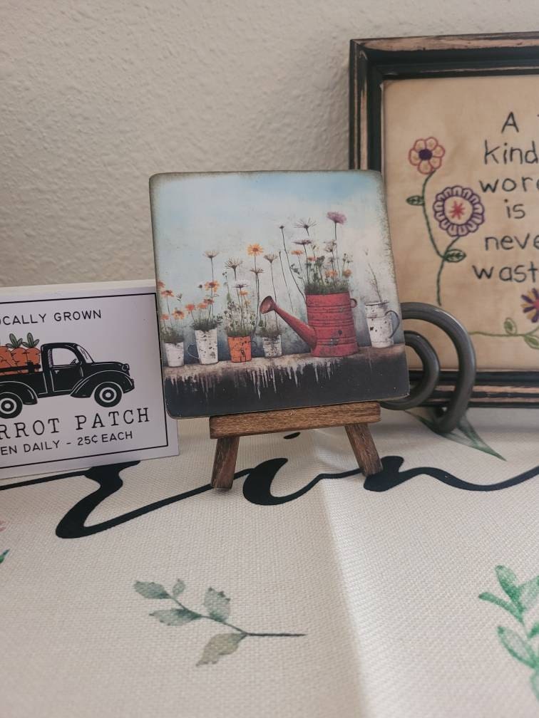 So, what are you waiting for? Add a touch of whimsy and a splash of color to your spring collection. Get your hands on these charming mini wood signs with matching easels today! Your shelves, tiered trays, or desk will thank you for it. 😉